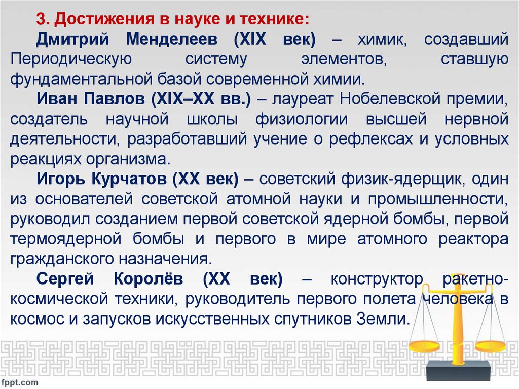 3. Достижения в науке и технике:Дмитрий Менделеев (XIX век) – химик, создавший