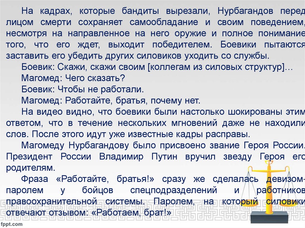На кадрах, которые бандиты вырезали, Нурбагандов передлицом смерти сохраняет самообладание и своим поведением,