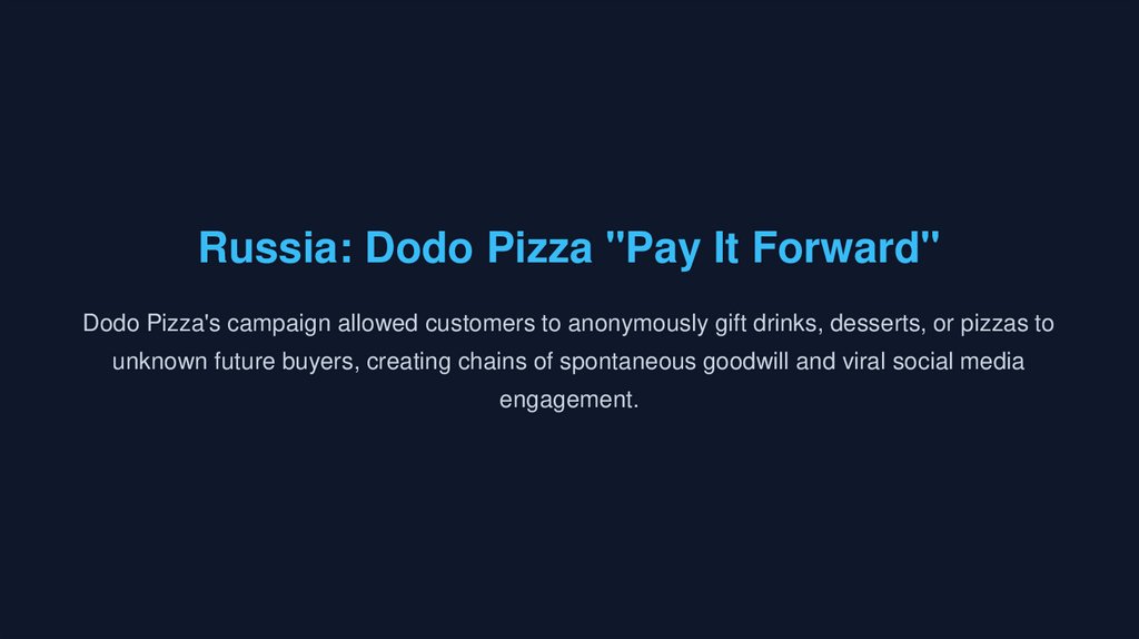 Russia: Dodo Pizza "Pay It Forward"Dodo Pizza's campaign allowed customers to anonymously gift drinks, desserts, or pizzas to