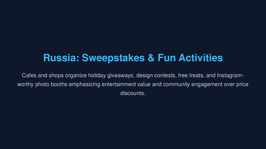 Russia: Sweepstakes & Fun ActivitiesCafes and shops organize holiday giveaways, design contests, free treats, and Instagramworthy photo booths emphasizing entertainment value and community engagement over price