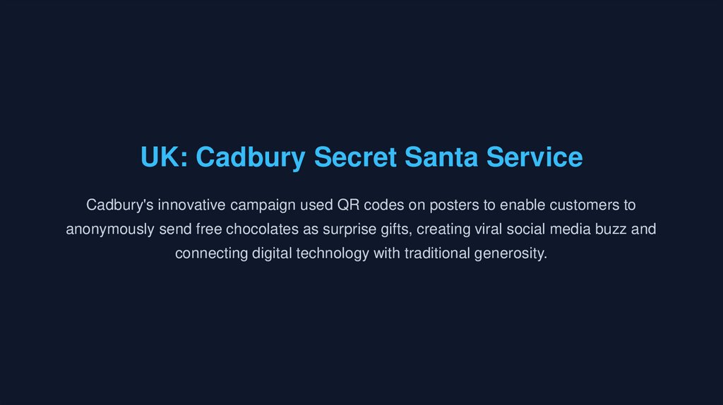 UK: Cadbury Secret Santa ServiceCadbury's innovative campaign used QR codes on posters to enable customers to