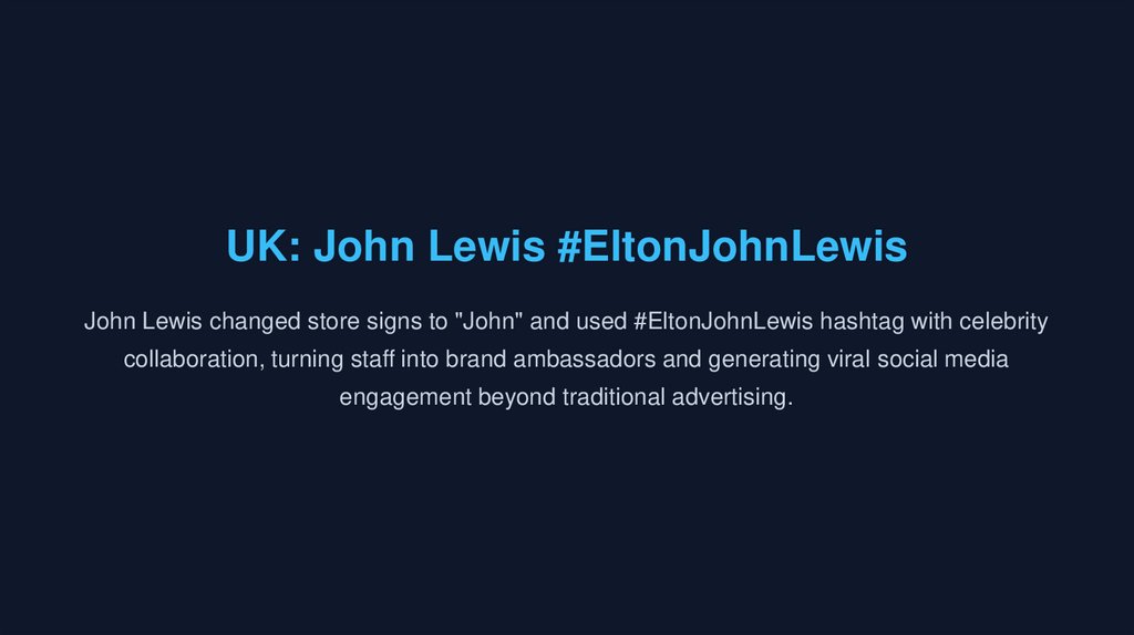 UK: John Lewis #EltonJohnLewisJohn Lewis changed store signs to "John" and used #EltonJohnLewis hashtag with celebrity