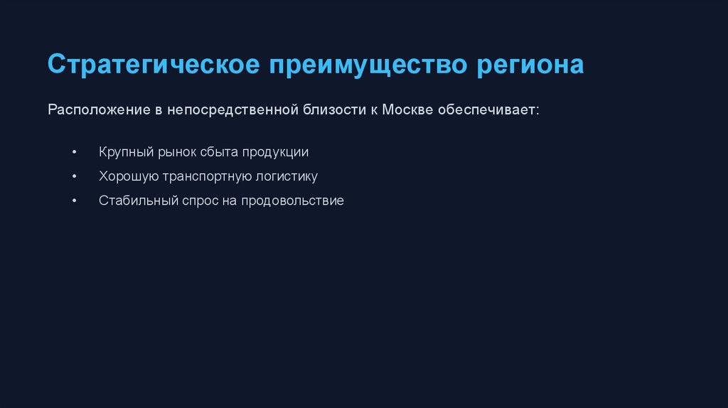 Стратегическое преимущество регионаРасположение в непосредственной близости к Москве обеспечивает: