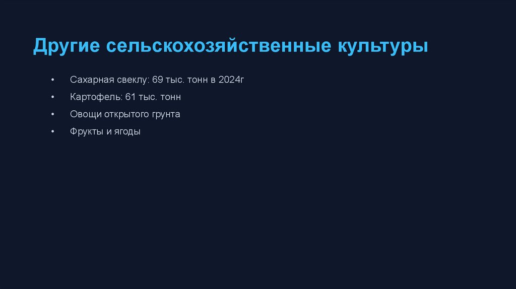 Другие сельскохозяйственные культурыСахарная свеклу: 69 тыс. тонн в 2024г