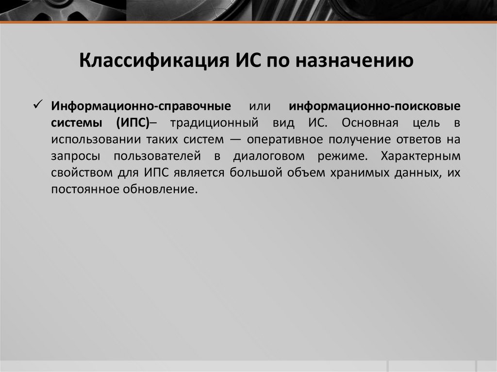 Классификация ИС по назначениюИнформационно-справочные или информационно-поисковые