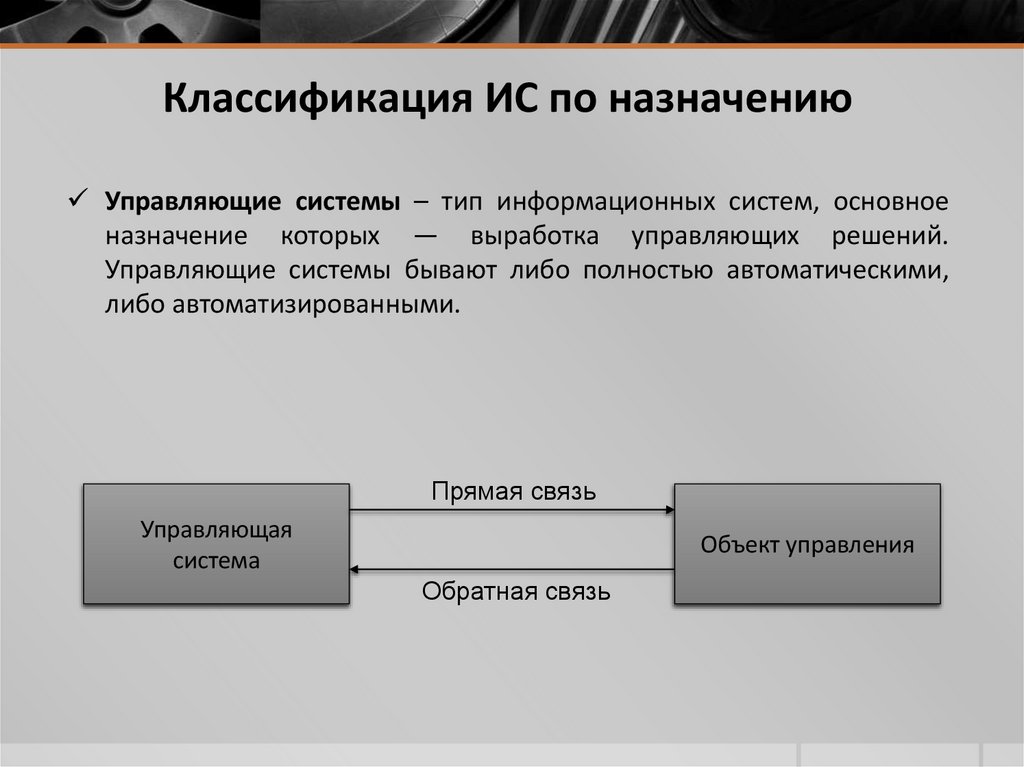 Классификация ИС по назначениюУправляющие системы – тип информационных систем, основное