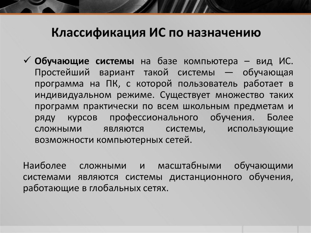Классификация ИС по назначениюОбучающие системы на базе компьютера – вид ИС.