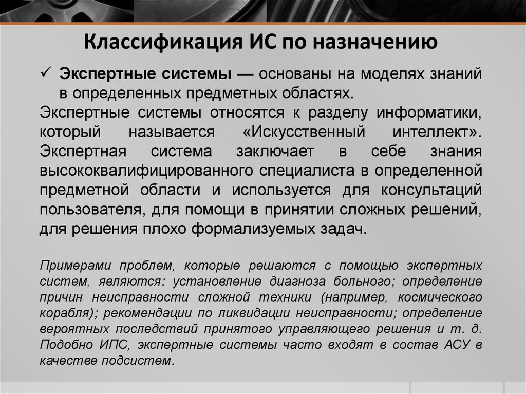 Классификация ИС по назначениюЭкспертные системы — основаны на моделях знаний