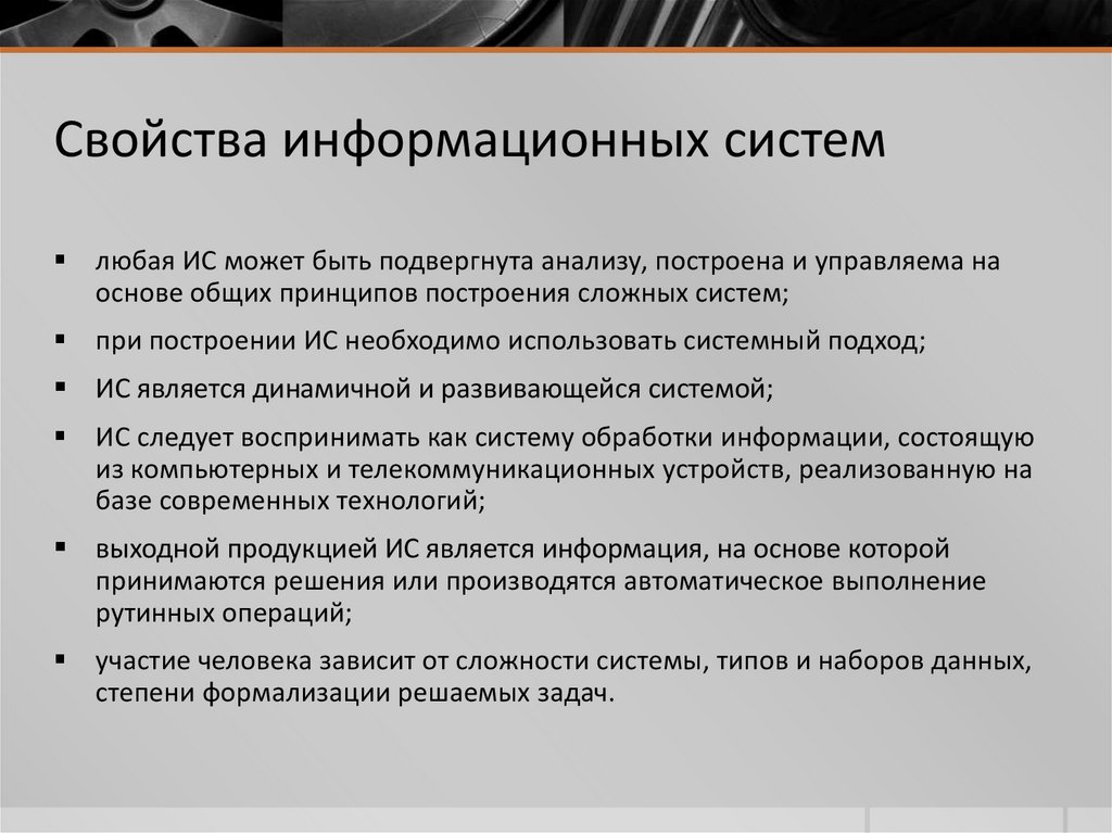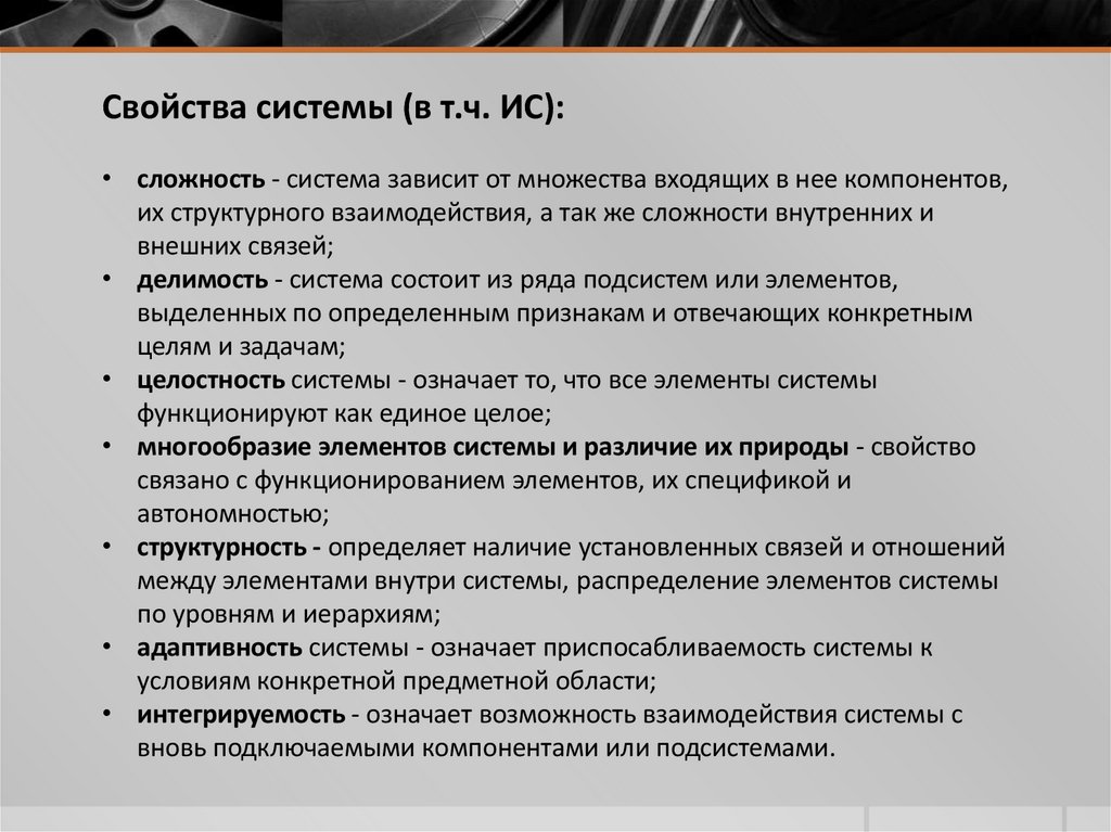Свойства системы (в т.ч. ИС):• сложность - система зависит от множества входящих в нее компонентов,