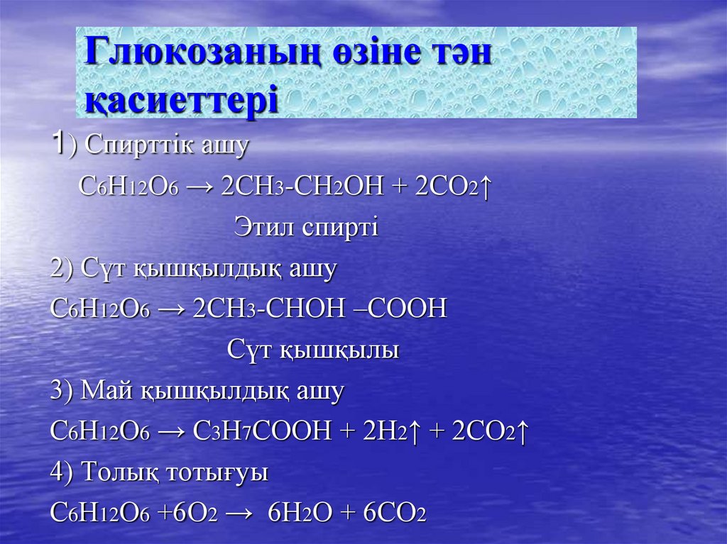 1) Спирттік ашуС6Н12О6 → 2СН3-СН2ОН + 2СО2↑