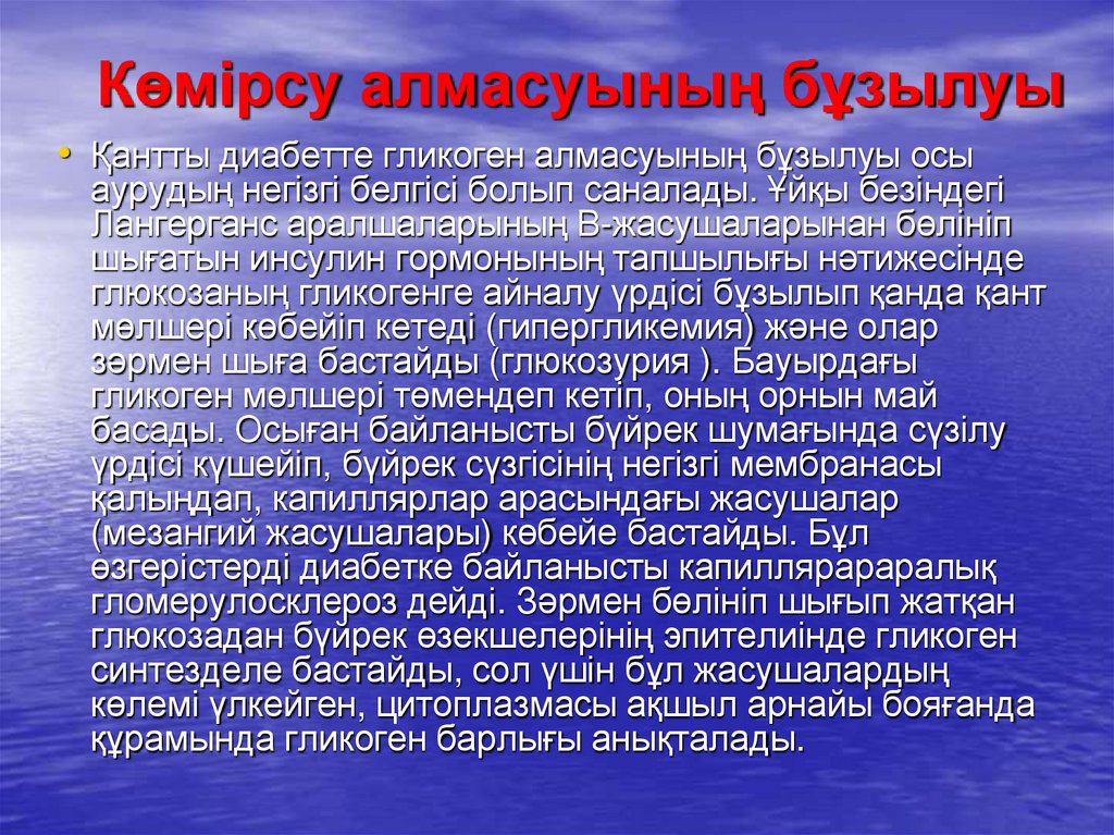 • Қантты диабетте гликоген алмасуының бұзылуы осыаурудың негізгі белгісі болып саналады. Ұйқы безіндегі