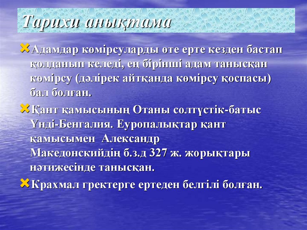 Адамдар көмірсуларды өте ерте кезден бастапқолданып келеді, ең бірінші адам танысқан