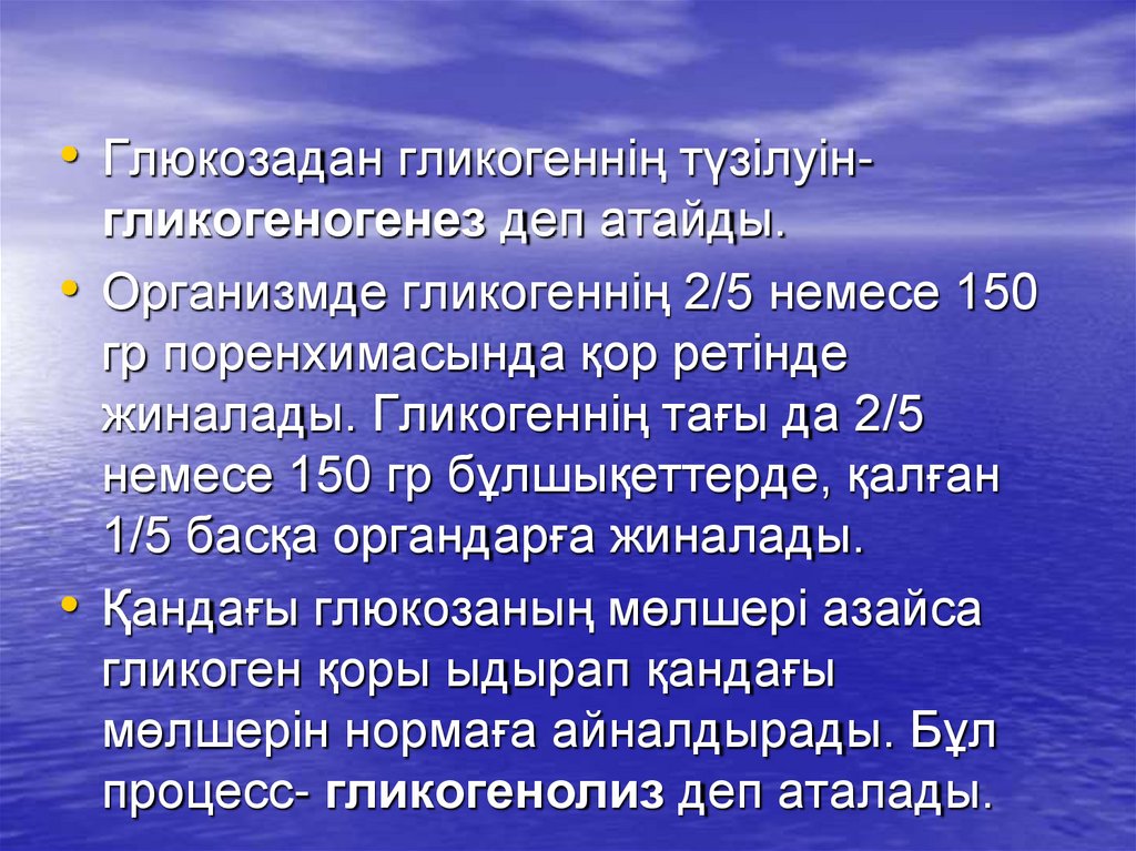 • Глюкозадан гликогеннің түзілуінгликогеногенез деп атайды.• Организмде гликогеннің 2/5 немесе 150