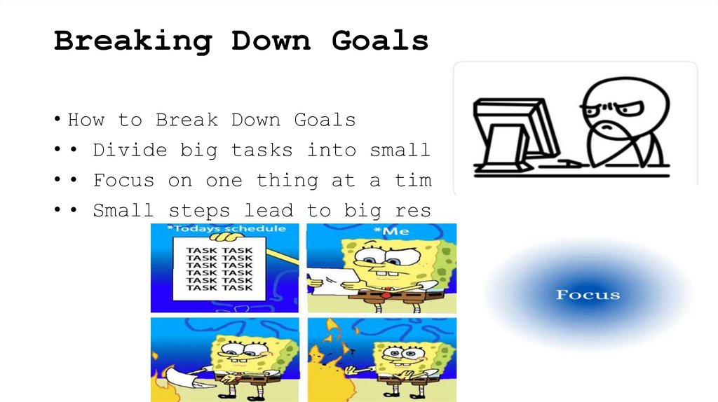 • How to Break Down Goals• • Divide big tasks into smaller parts