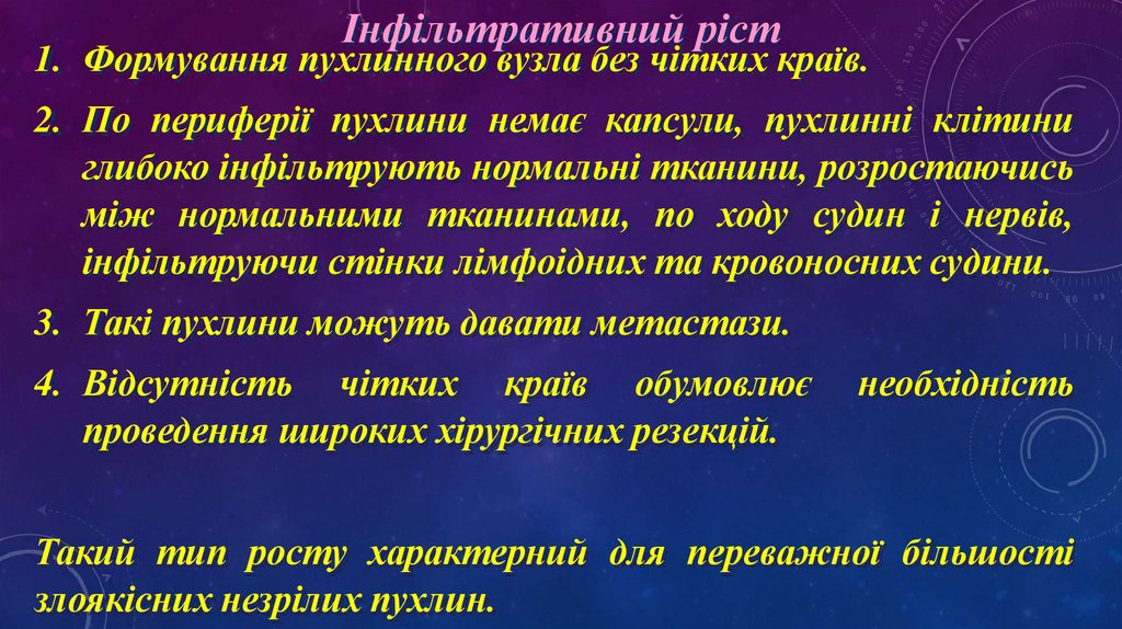 Інфільтративний ріст1. Формування пухлинного вузла без чітких країв.