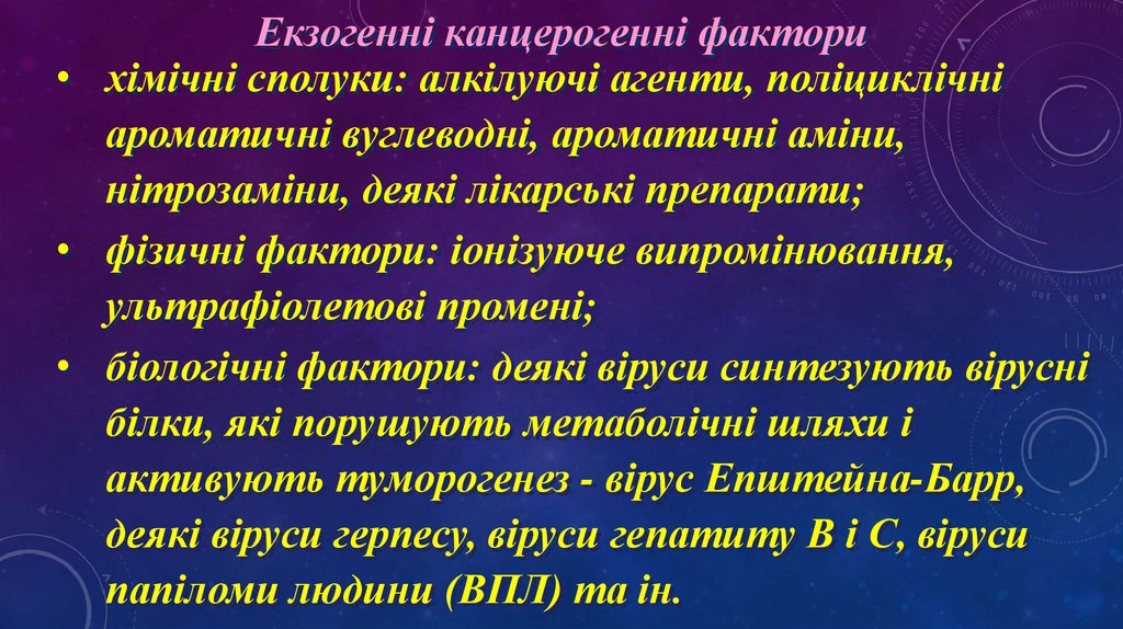Екзогенні канцерогенні фактори• хімічні сполуки: алкілуючі агенти, поліциклічні