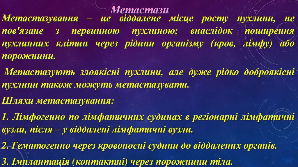 МетастазиМетастазування – це віддалене місце росту пухлини, не