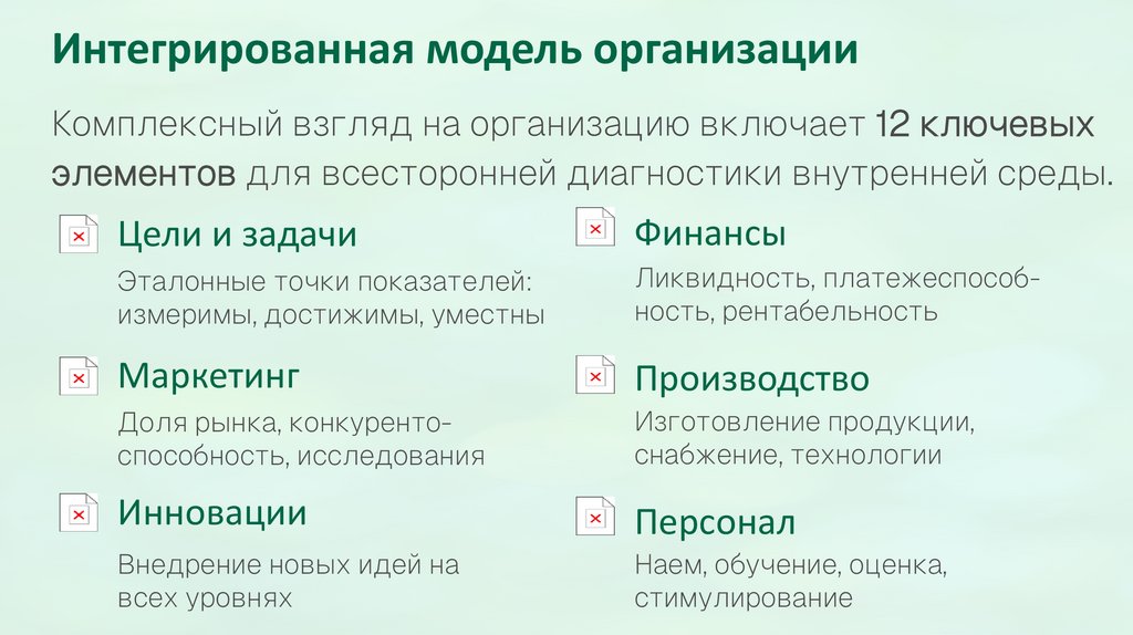 Интегрированная модель организацииКомплексный взгляд на организацию включает 12 ключевых