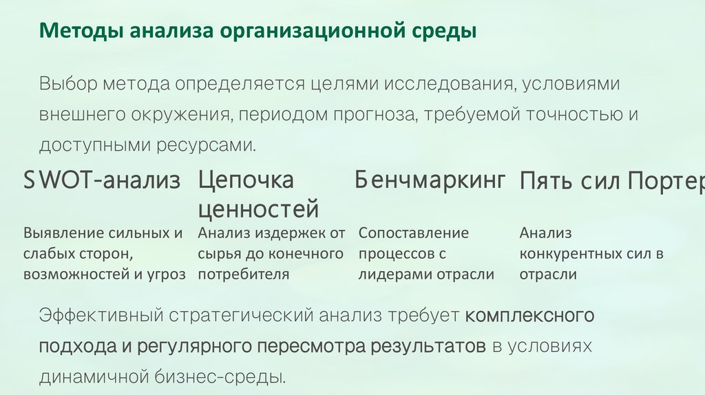 Методы анализа организационной средыВыбор метода определяется целями исследования, условиями
