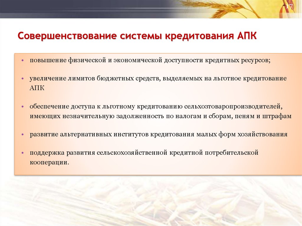 • обеспечение доступа к льготному кредитованию сельхозтоваропроизводителей,