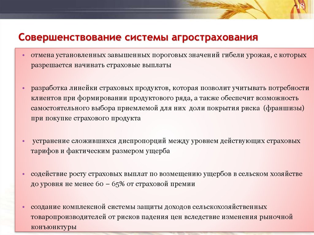 • содействие росту страховых выплат по возмещению ущербов в сельском хозяйстве