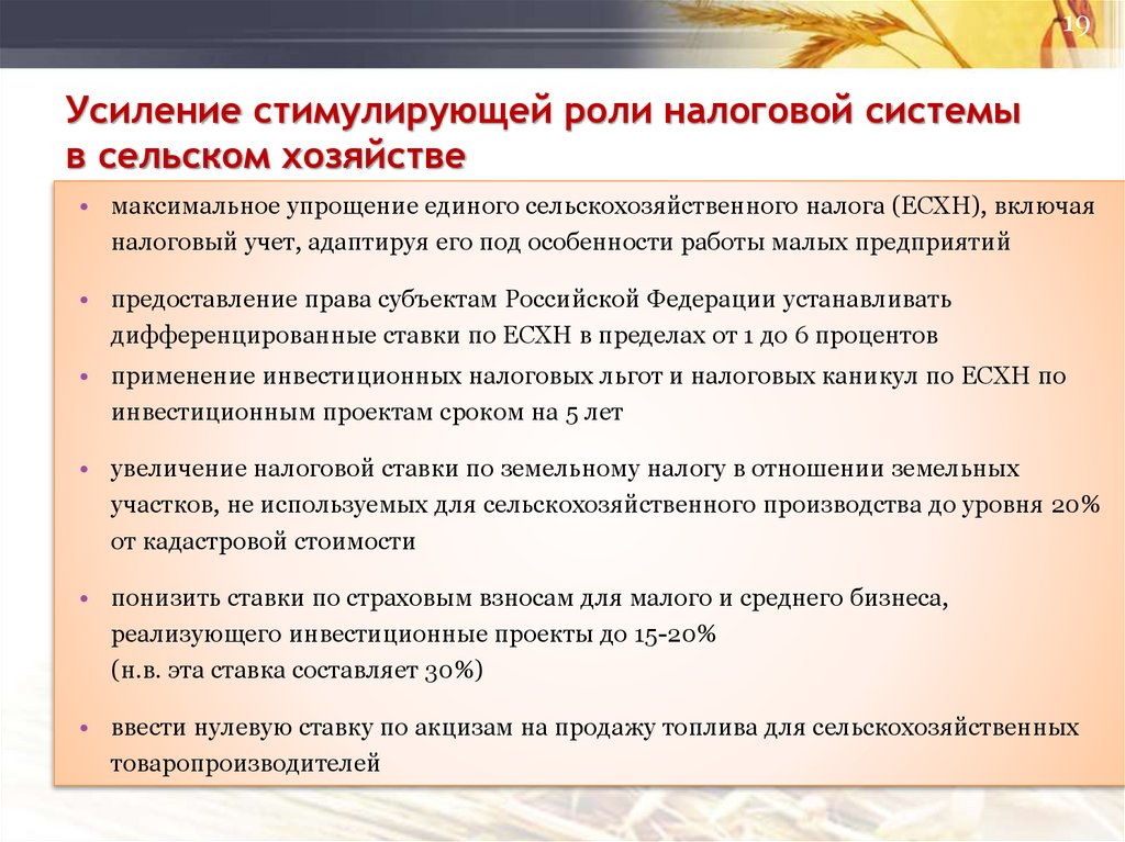 19. Усиление стимулирующей роли налоговой системы в сельском хозяйстве