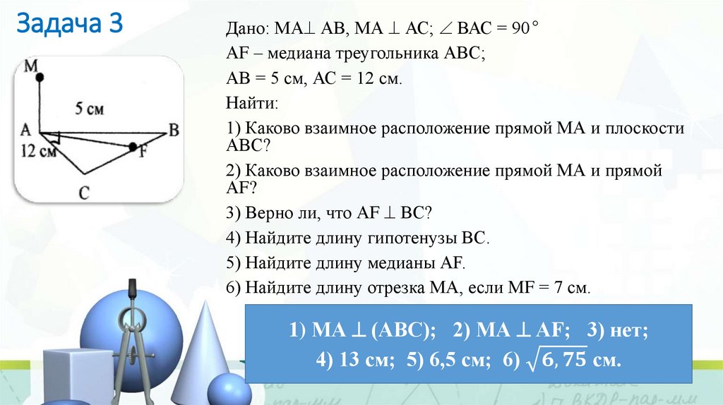 Дано: МА АВ, МА АС; ВАС = 90°АF – медиана треугольника АВС;