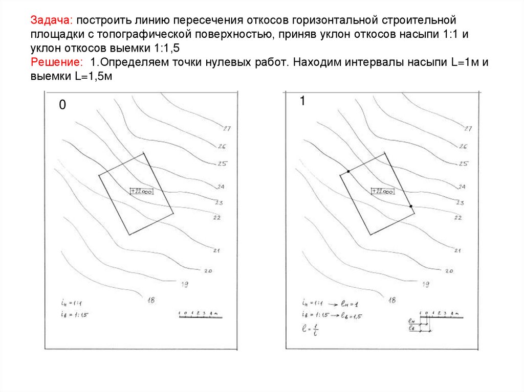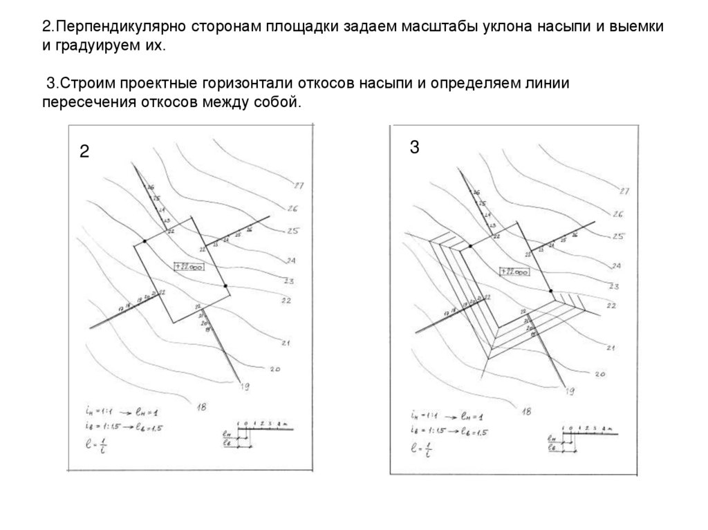 2. 2.Перпендикулярно сторонам площадки задаем масштабы уклона насыпи и выемки и градуируем их. 3.Строим проектные горизонтали
