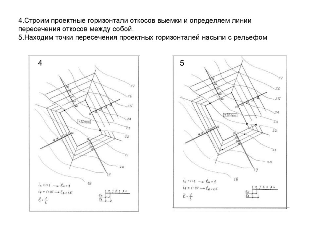 3. 4.Строим проектные горизонтали откосов выемки и определяем линии пересечения откосов между собой. 5.Находим точки пересечения