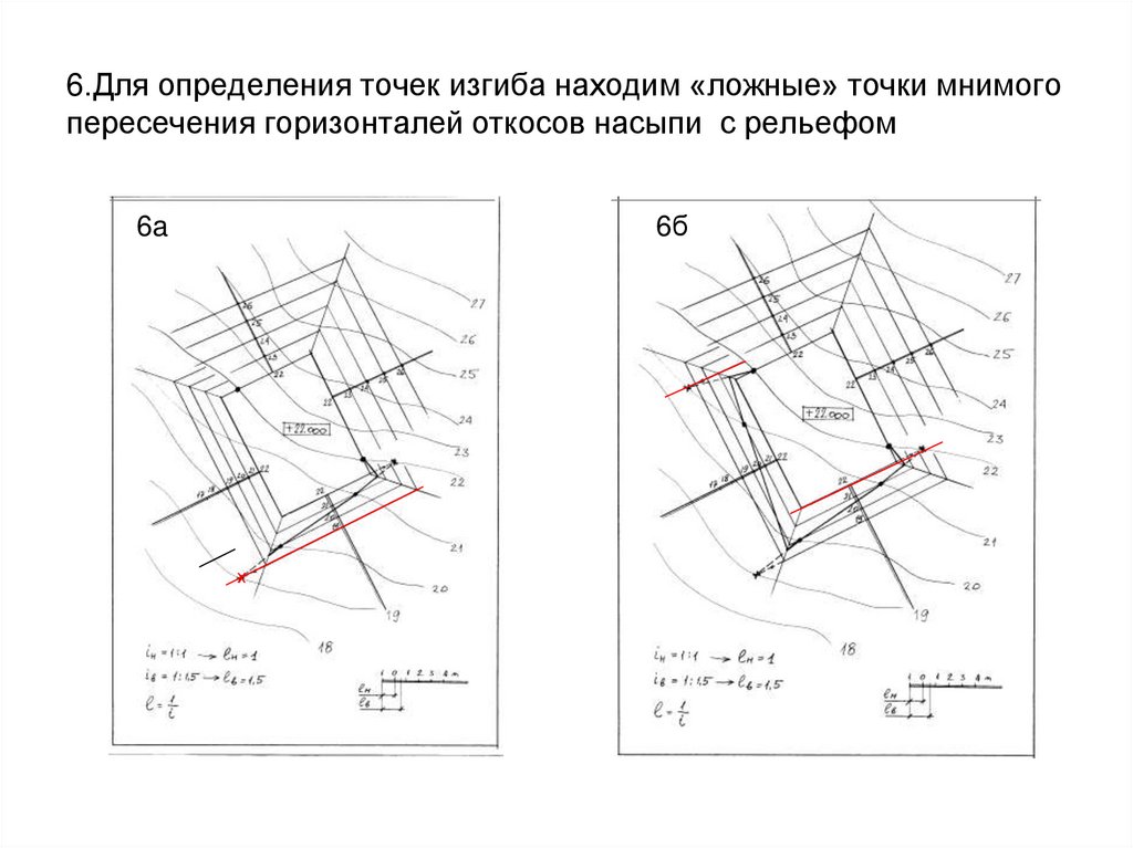 4. 6.Для определения точек изгиба находим «ложные» точки мнимого пересечения горизонталей откосов насыпи с рельефом