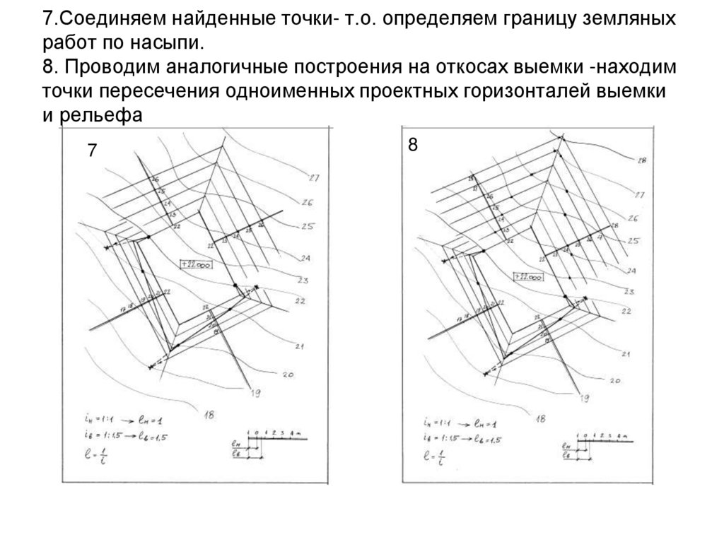 5. 7.Соединяем найденные точки- т.о. определяем границу земляных работ по насыпи. 8. Проводим аналогичные построения на откосах