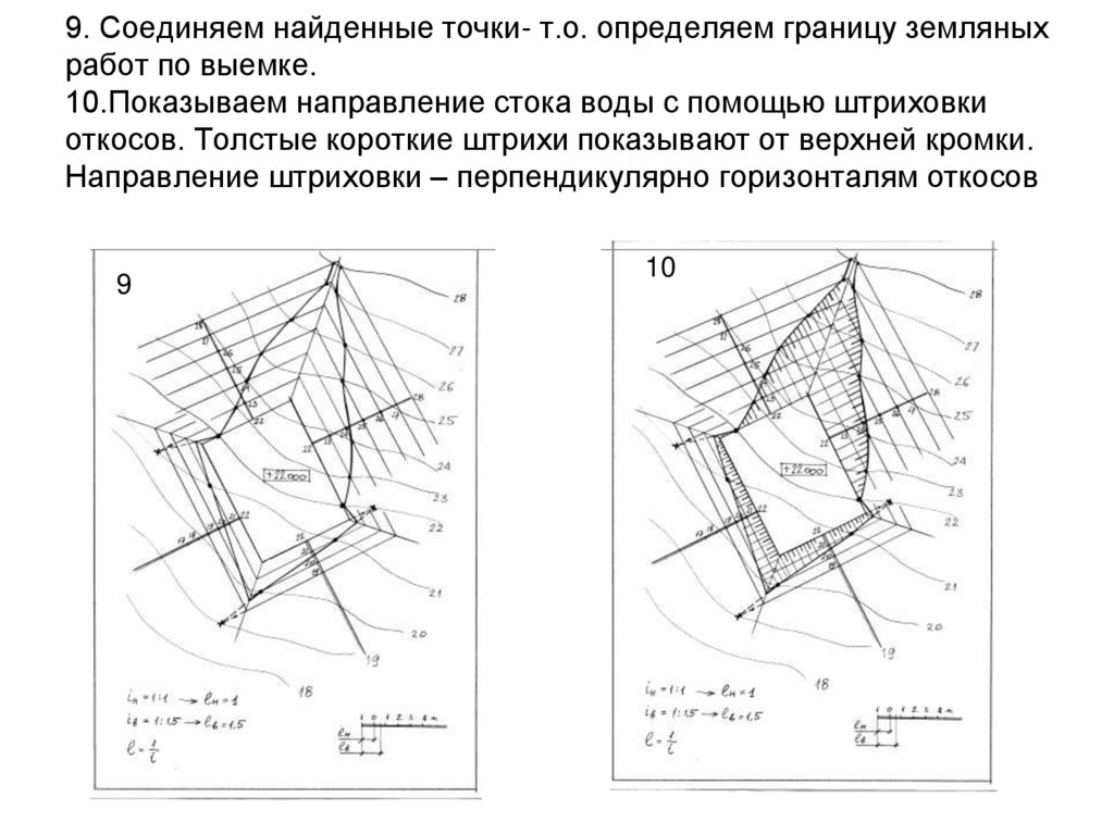 6. 9. Соединяем найденные точки- т.о. определяем границу земляных работ по выемке. 10.Показываем направление стока воды с помощью