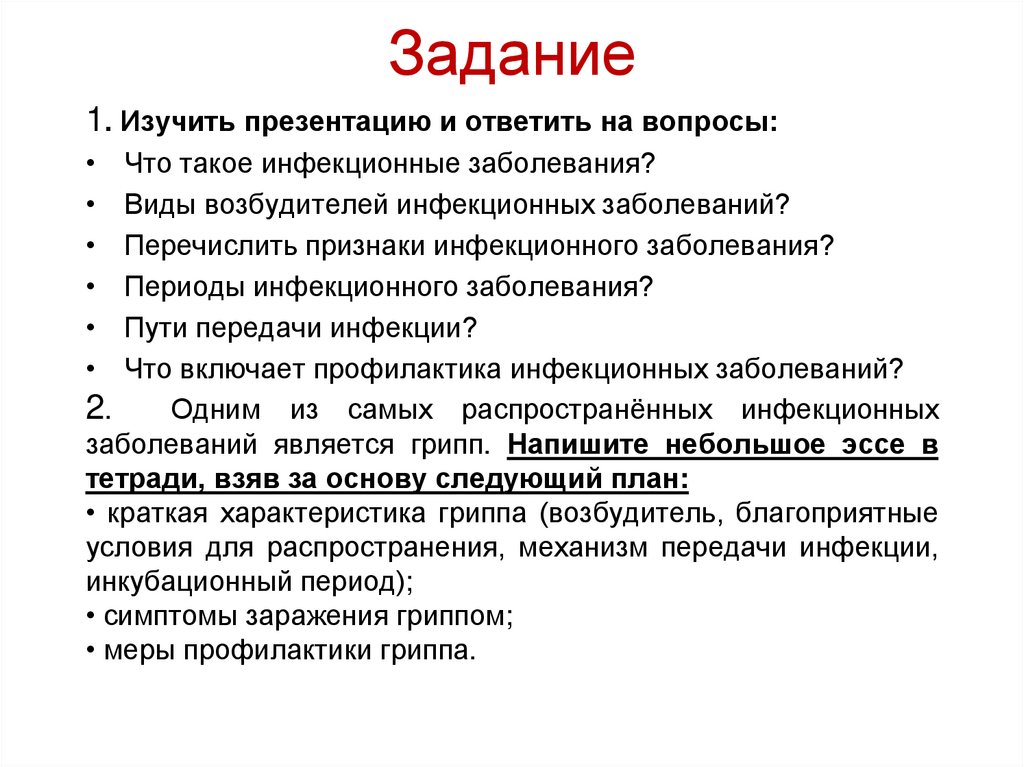 1. Изучить презентацию и ответить на вопросы:Что такое инфекционные заболевания?