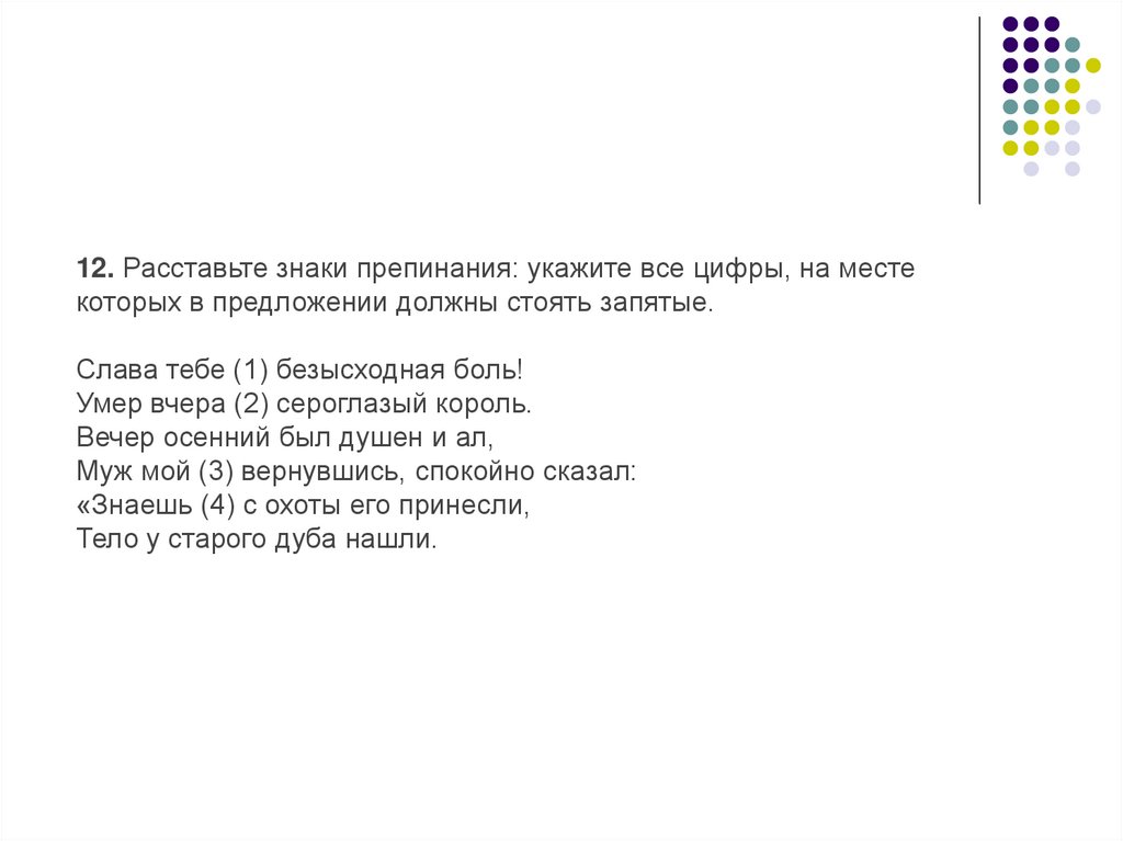 12. Расставьте знаки препинания: укажите все цифры, на местекоторых в предложении должны стоять запятые.