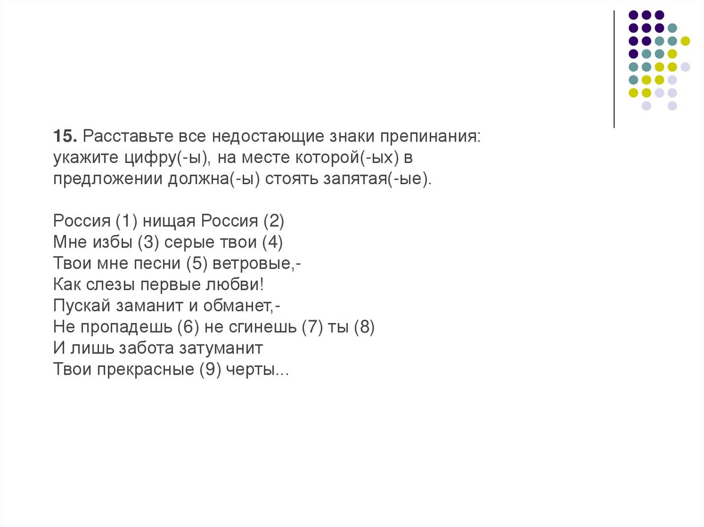 15. Расставьте все недостающие знаки препинания:укажите цифру(-ы), на месте которой(-ых) в
