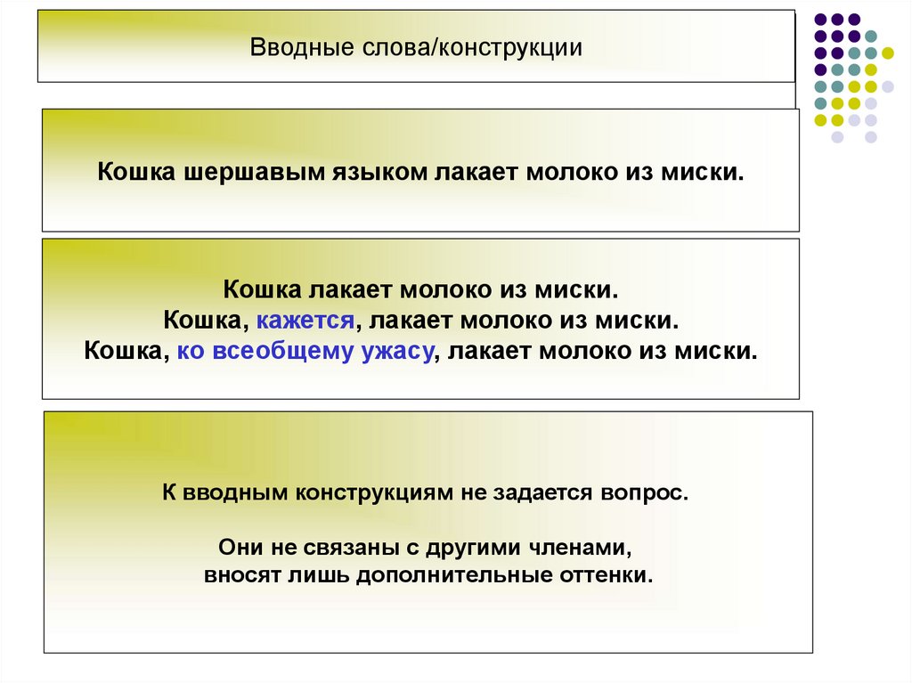 Вводные слова/конструкцииКошка шершавым языком лакает молоко из миски.