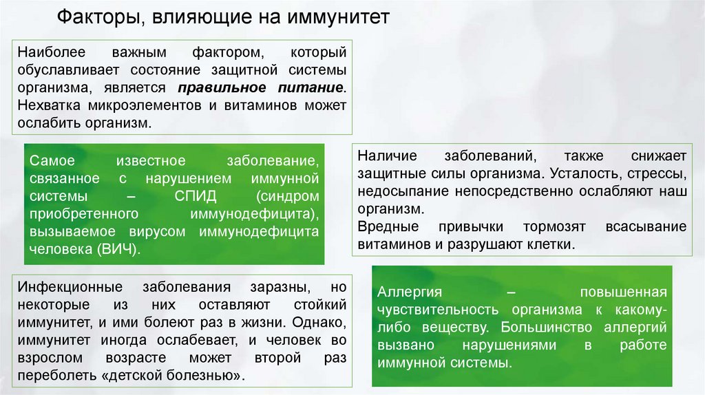 Факторы, влияющие на иммунитетНаиболее