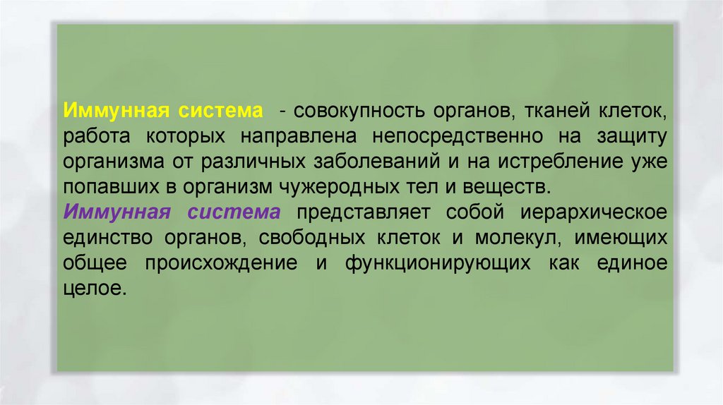 Иммунная система - совокупность органов, тканей клеток,работа которых направлена непосредственно на защиту