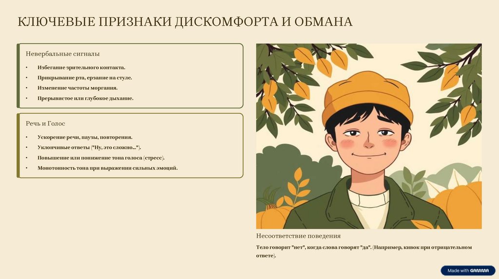 КЛЮЧЕВЫЕ ПРИЗНАКИ ДИСКОМФОРТА И ОБМАНАНевербальные сигналы