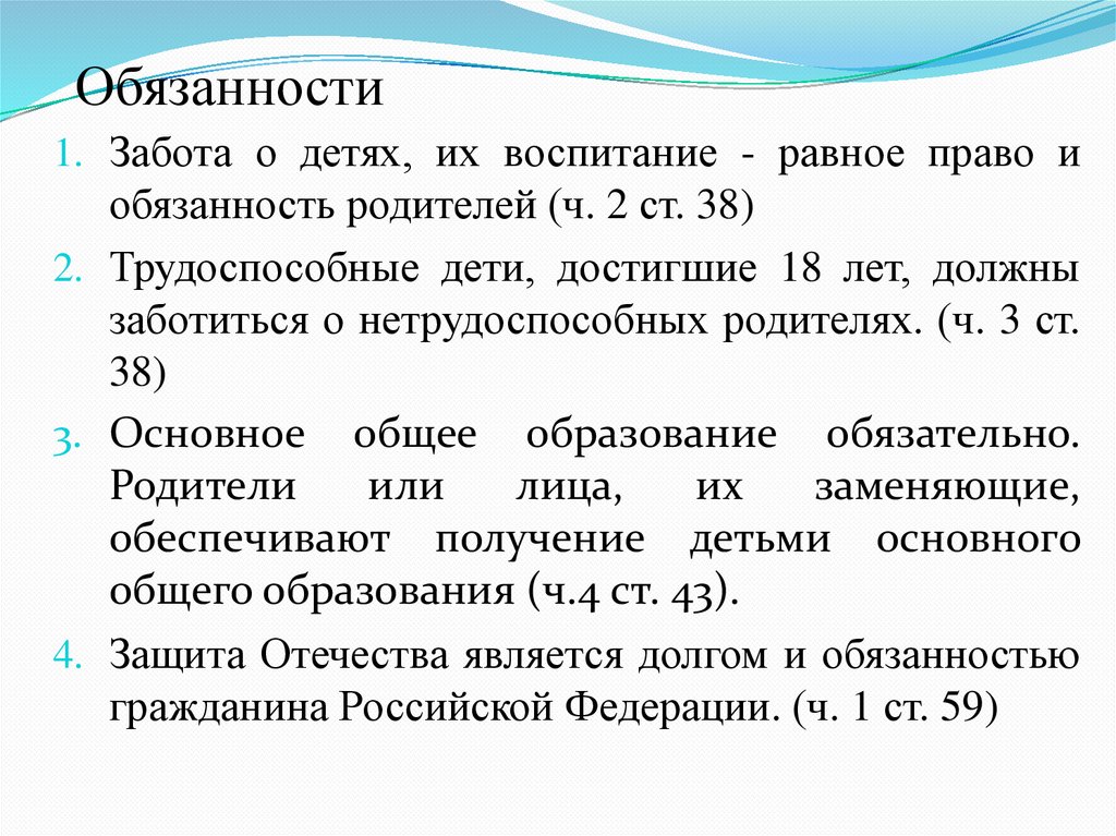 1. Забота о детях, их воспитание - равное право иобязанность родителей (ч. 2 ст. 38)