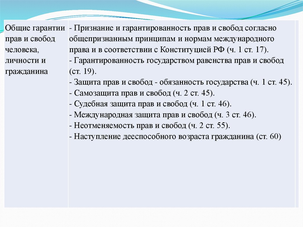 Общие гарантии - Признание и гарантированность прав и свобод согласноправ и свобод