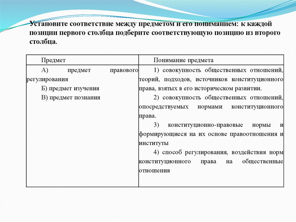 Установите соответствие между предметом и его пониманием: к каждойпозиции первого столбца подберите соответствующую позицию из второго