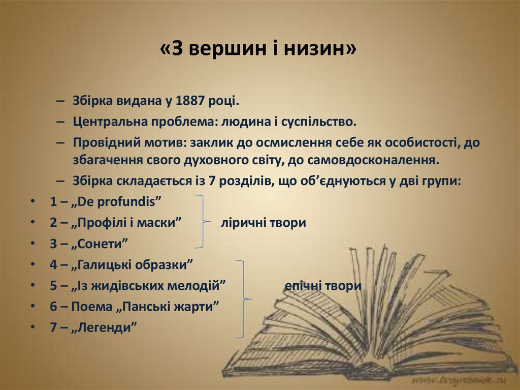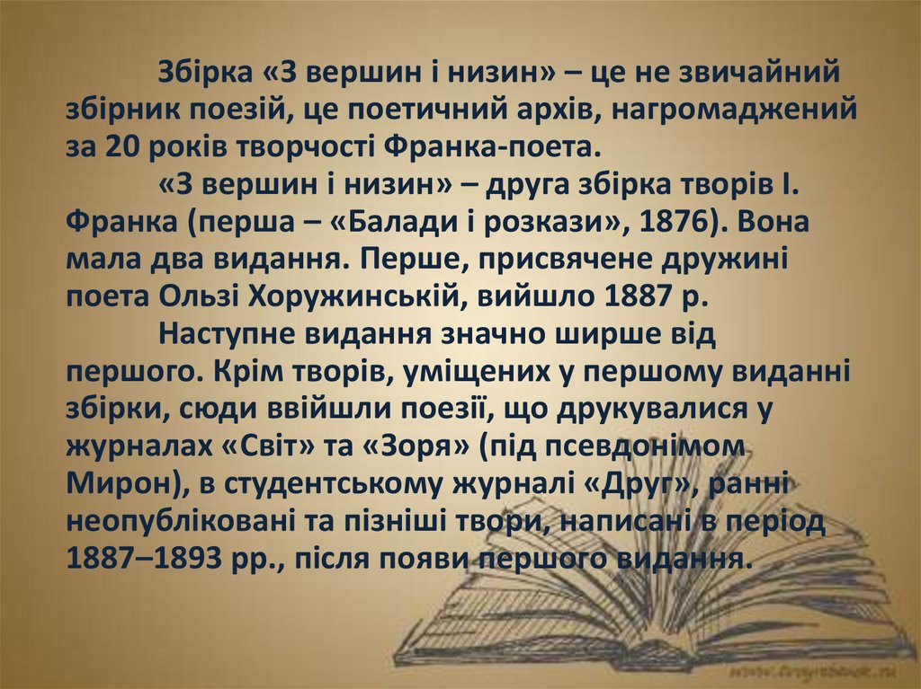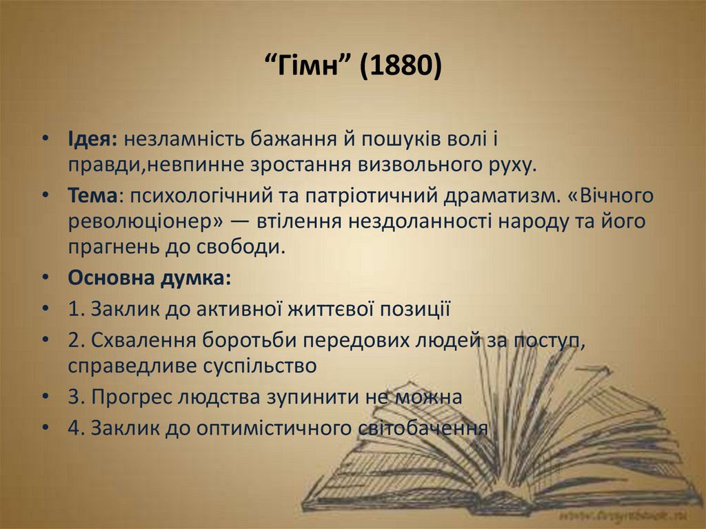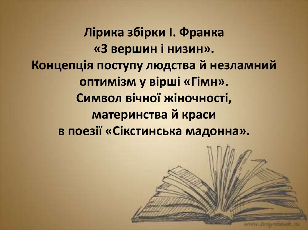 1. Лірика збірки І. Франка «З вершин і низин». Концепція поступу людства й незламний оптимізм у вірші «Гімн». Символ вічної