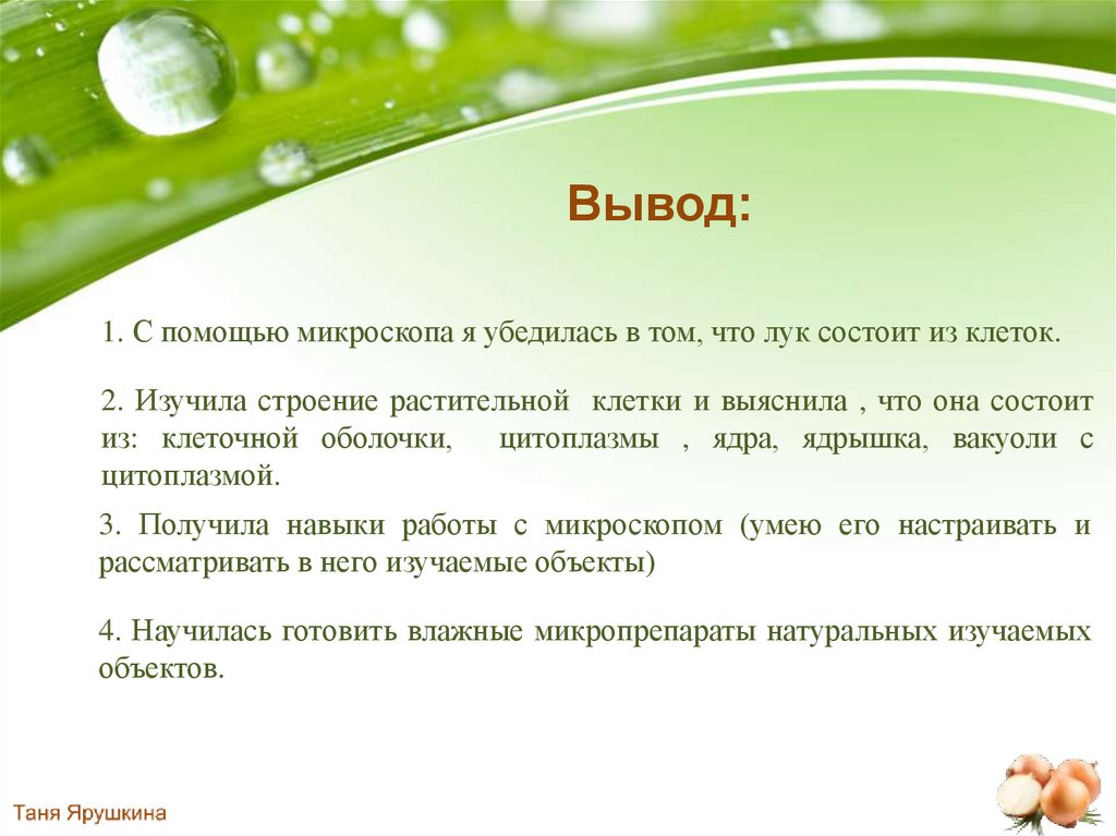 Вывод:1. С помощью микроскопа я убедилась в том, что лук состоит из клеток.