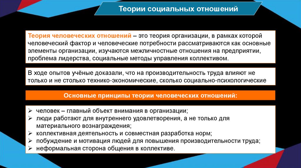 Теории социальных отношенийТеория человеческих отношений – это теория организации, в рамках которой