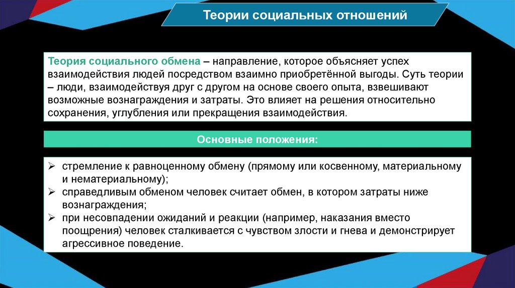 Теории социальных отношенийТеория социального обмена – направление, которое объясняет успех