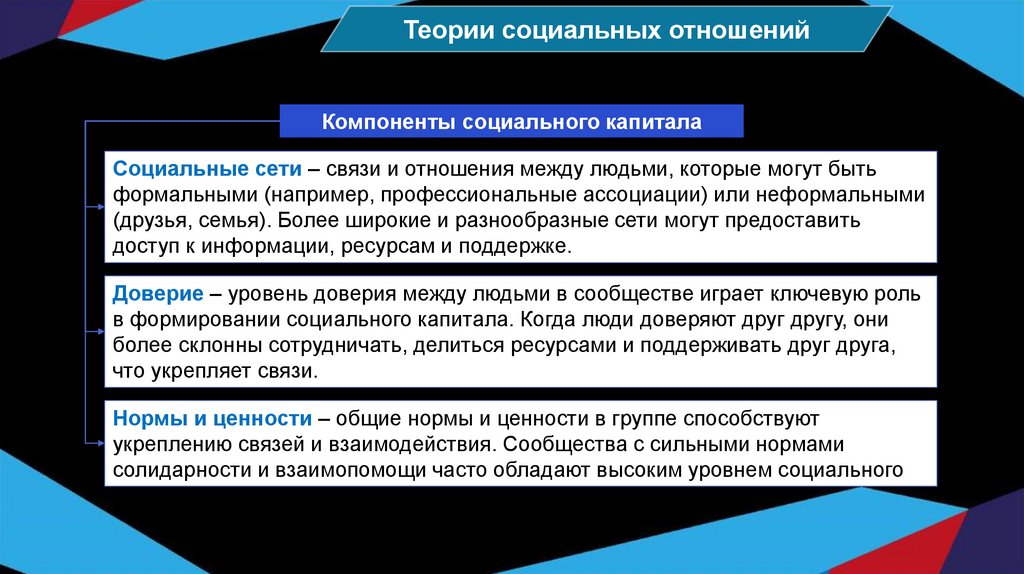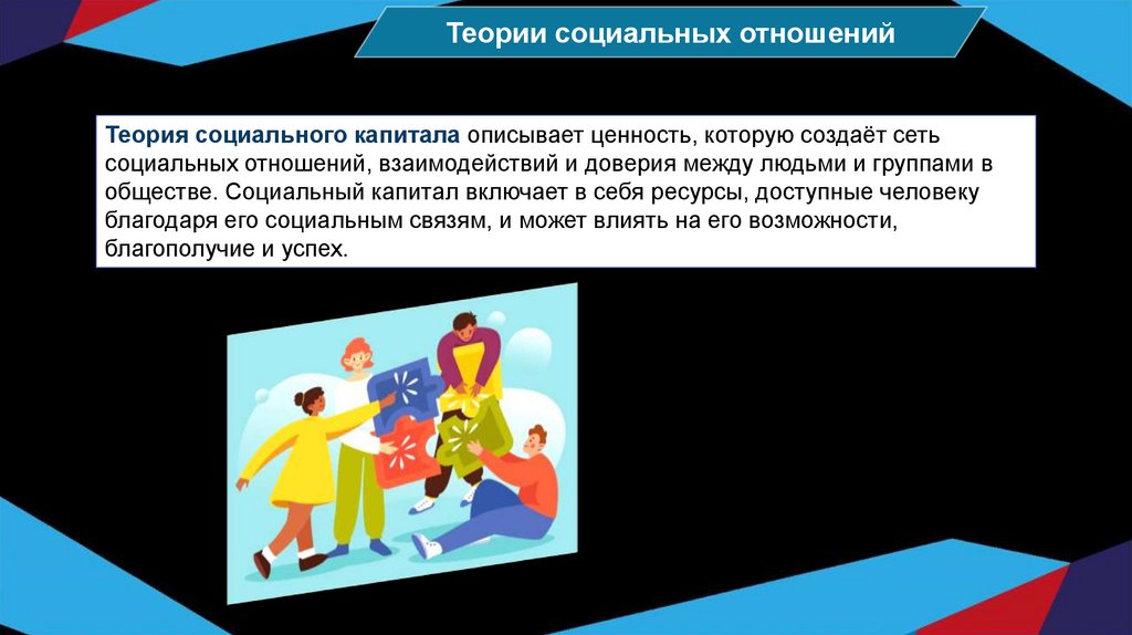 Теории социальных отношенийТеория социального капитала описывает ценность, которую создаёт сеть