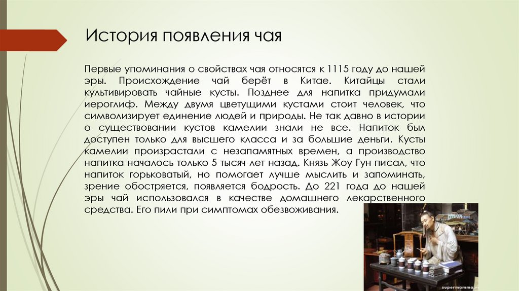 эры. Происхождение чай берёт в Китае. Китайцы стали