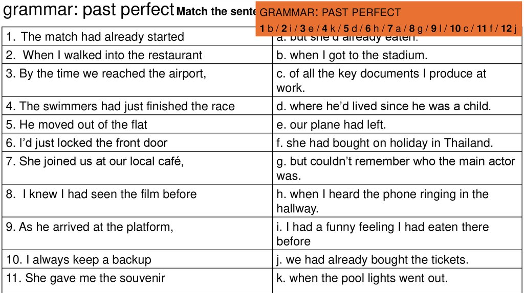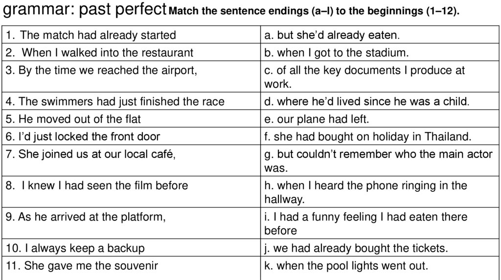 11. grammar: past perfect Match the sentence endings (a–l) to the beginnings (1–12).