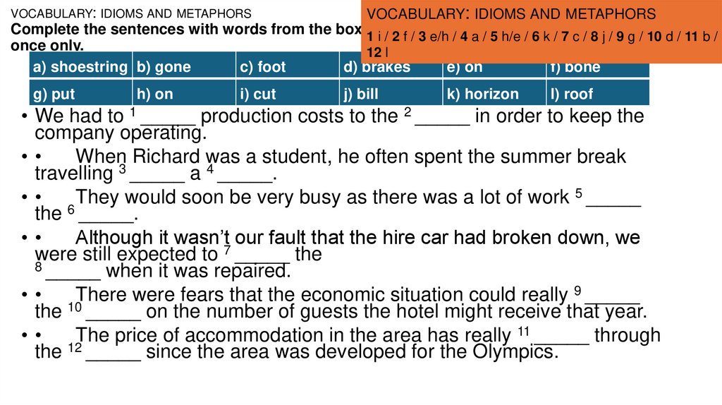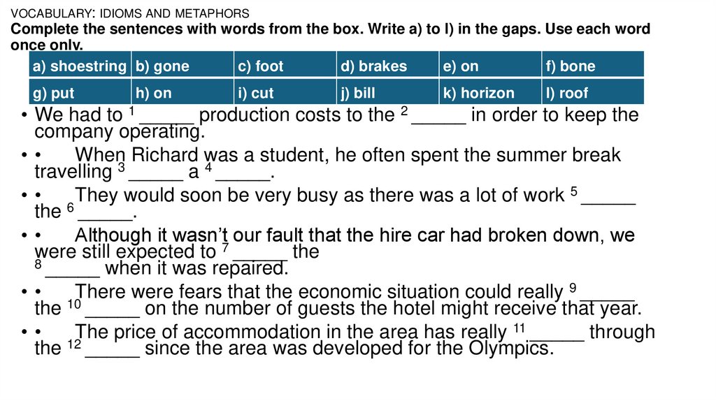VOCABULARY: IDIOMS AND METAPHORSComplete the sentences with words from the box. Write a) to l) in the gaps. Use each word